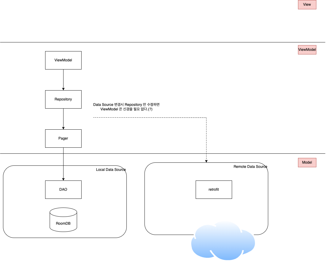 일반적인 앱에서 저장소는 네트워크에서 데이터를 가져올지, 로컬 DB 에 캐시된 결과를 사용할지 결정하는 로직을 구현한다. MVVM 의 경우 뷰모델이 위 같은 역할을 한다.